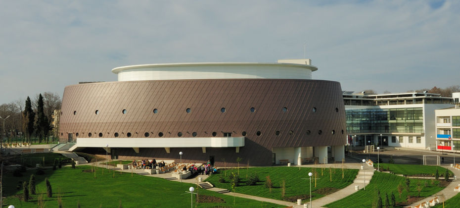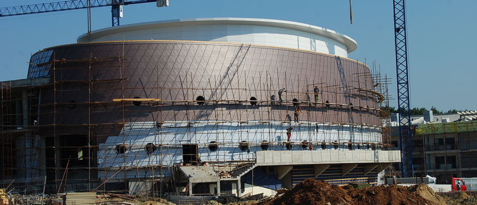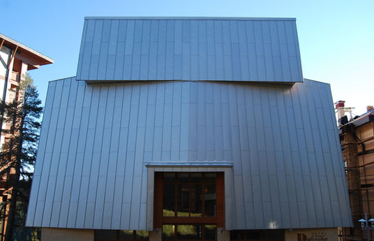 "Фасадата на кино-концертна зала е изпълнена с облицовка от титан – цинк ламарина при оформяне на сложни форми и тя се явява като акцент в цялостното фасадно оформяне на комплекса." конкурса "Сграда на годината"